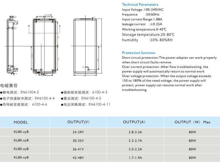 過流保護(hù):過流故障排除后,電源將自動(dòng)恢復(fù)正常工作 過壓保護(hù):當(dāng)輸出電壓超過額定電壓的150~180%時(shí),電源將保護(hù),故障排除后電源能恢復(fù)正常工作 輸入電壓:100-240VAC 頻率:50/60Hz 輸入電流:1.88A 漏電電流:<0.25A 工作溫度:0-40℃ 貯藏溫度:-20-80℃ 濕度:10%-80%RH" />